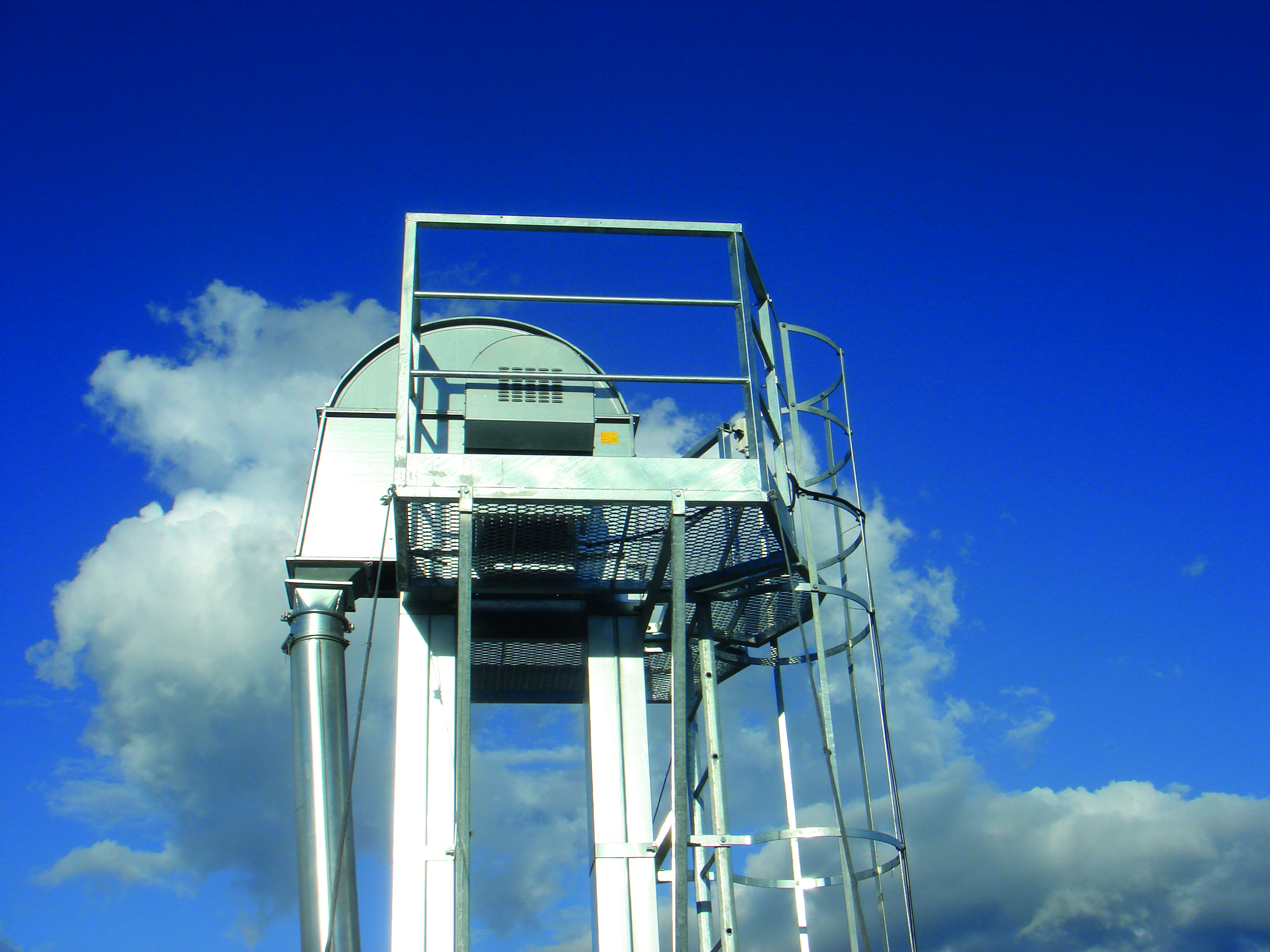 Den fritstående kopelevator kan leveres med serviceplatform ved elevatortop samt lejder med rygbøjle på elevatorrør samt meget andet udstyr.